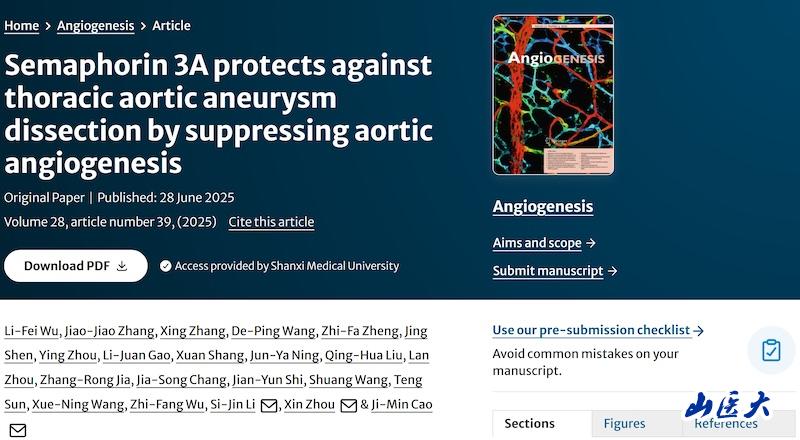 6月28日,我校细胞生理学教育部重点实验室曹济民教授团队在血管再生领域的国际权威期刊《Angiogenesis》(中国科学院一区TOP期刊,IF=9.2)在线发表了题为“Semaphorin 3A protects against thoracic aortic aneurysm dissection by suppressing aortic angiogenesis”的研究论文(DOI: 10.1007/s10456-025-09992-6)。我校基础医学院讲师武栗妃为论文第一作者,曹济民教授为主通讯作者。